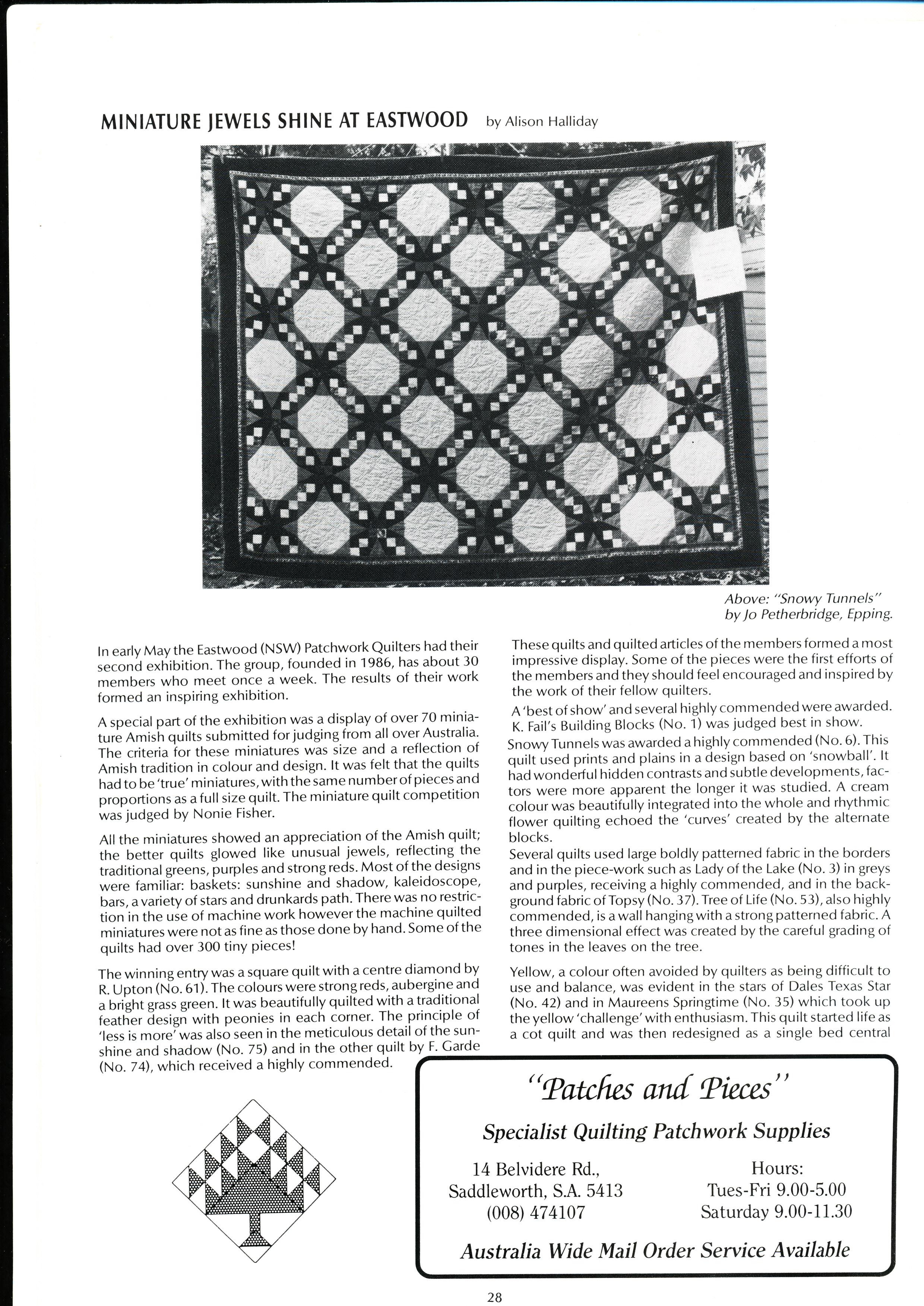 A History of Exhibitions Posted on March 23, 2013 by eastwoodpatchworkquilters Eastwood Patchwork Quilters have a long and very successful history of staging fantastic exhibitions. 1989 EPQ Exhibition – DuQ article Share this: Click to share on X (Opens in new window) X Click to share on Facebook (Opens in new window) Facebook Like Loading...