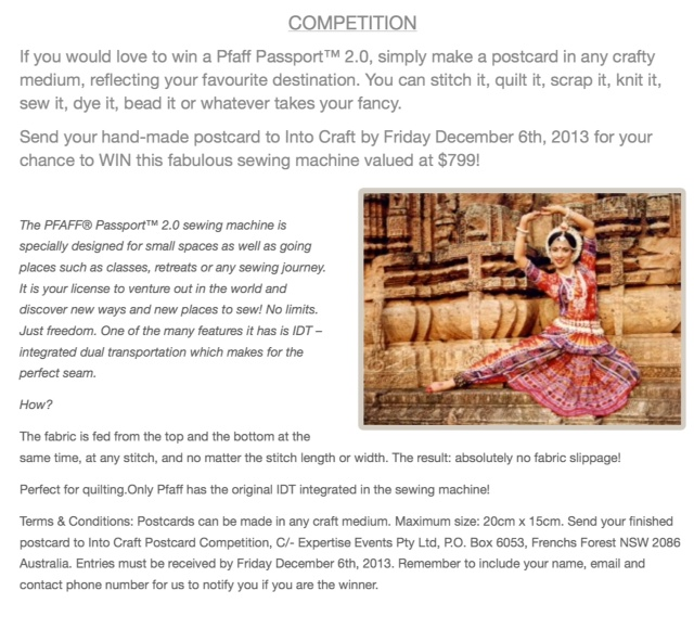 Well, here’s an easy way to do so. All you have to do is make a crafty postcard and submit it to Into Craft (click for more information) before December 6, 2013. The theme is your favourite destination.