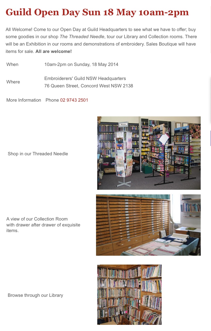 NSW Embroiderers Guild Open Day Posted on April 12, 2014 by eastwoodpatchworkquilters Share this: Click to share on X (Opens in new window) X Click to share on Facebook (Opens in new window) Facebook Like Loading...