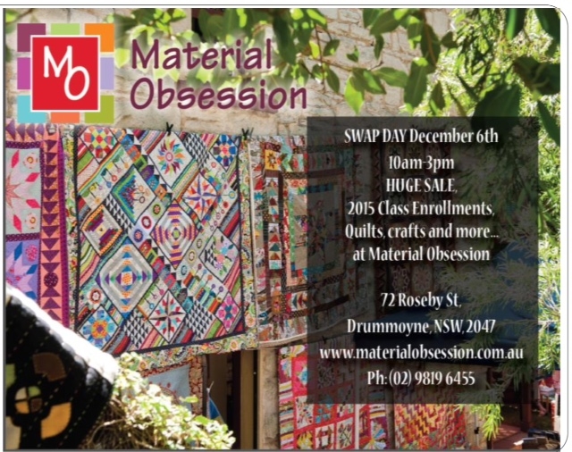 Material Obsession Swap Day Posted on October 30, 2014 by eastwoodpatchworkquilters MO swap day Share this: Click to share on X (Opens in new window) X Click to share on Facebook (Opens in new window) Facebook Like Loading...