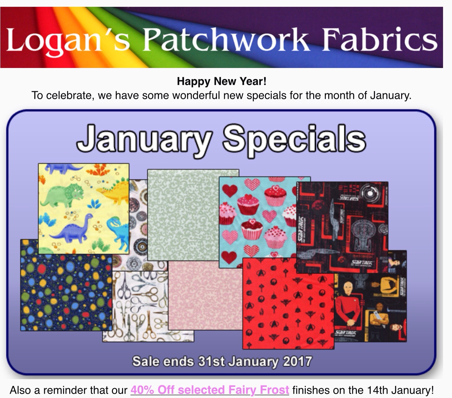 January Sale at Logan’s Posted on January 5, 2017 by eastwoodpatchworkquilters Check out the full catalogue on the website Share this: Click to share on X (Opens in new window) X Click to share on Facebook (Opens in new window) Facebook Like Loading...