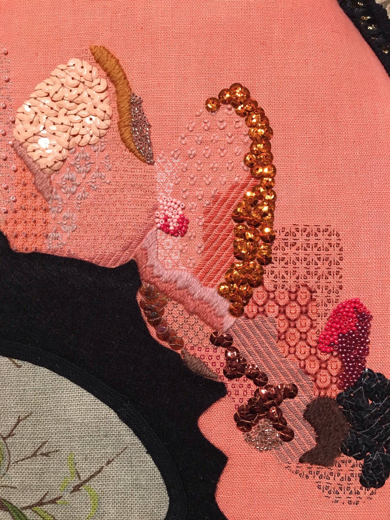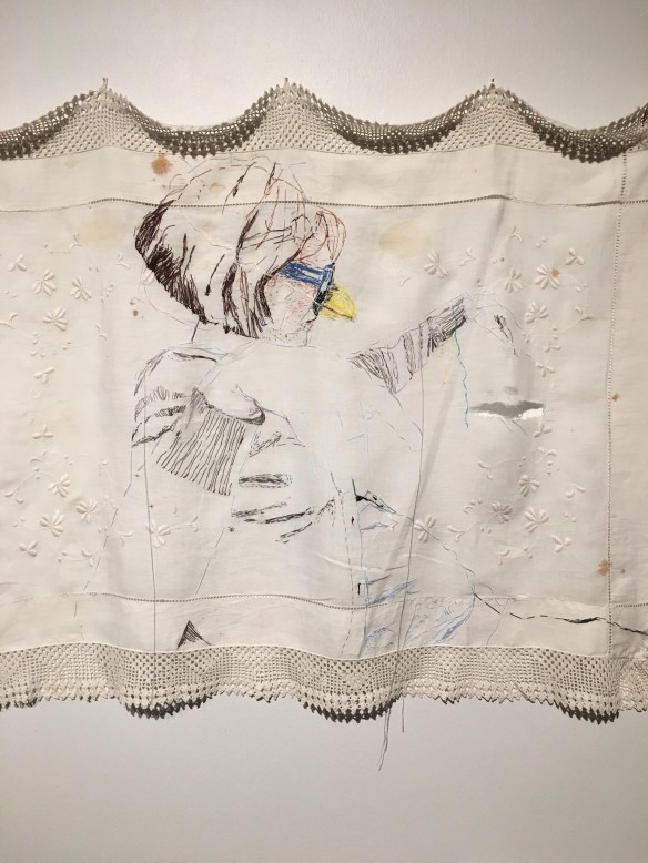 Slipstitch is an exhibition of contemporary embroidery from a diverse group of artists and on a wide range of subjects. The idea behind the exhibition is that embroidery can be used to convey messages in modern times just as it did in the past. I really appreciated that a number of the works featured reused textiles and materials. It was also great to see embroidery as a focus of a whole exhibition.