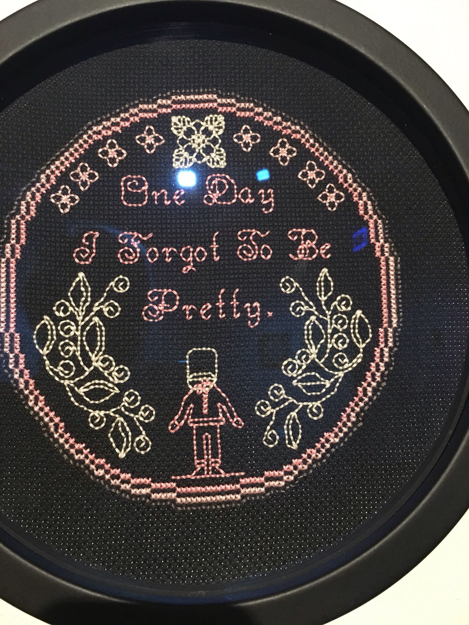 Here are a couple of my favourites – I love how the stitcher used traditional methods and materials to convey a modern message.