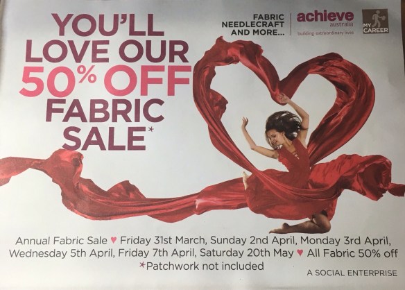 Fabric Sale starts tomorrow – 50% off Posted on March 29, 2017 by eastwoodpatchworkquilters Unfortunately patchwork fabric is not included, but we have assurances that there will be another sale later this year. Share this: Click to share on X (Opens in new window) X Click to share on Facebook (Opens in new window) Facebook Like Loading...