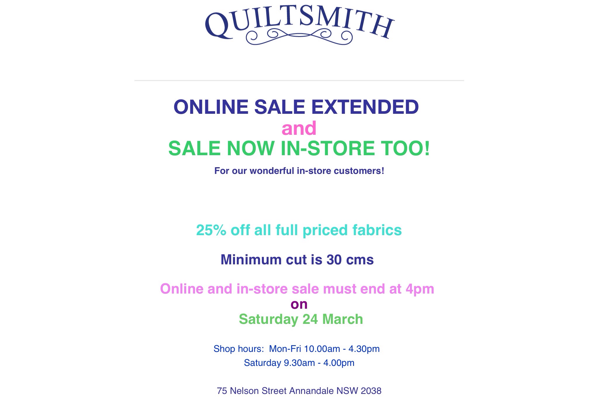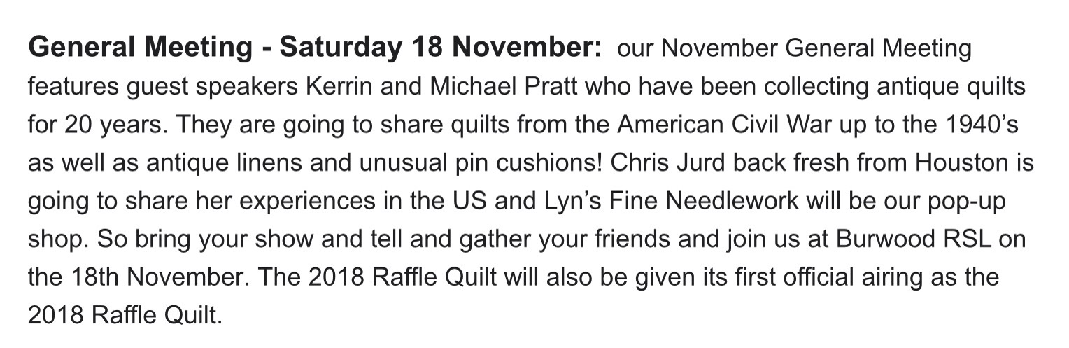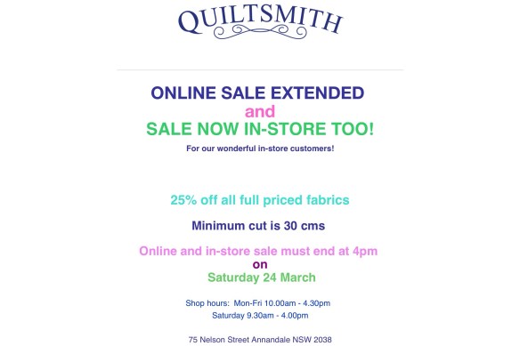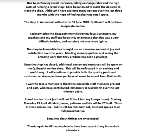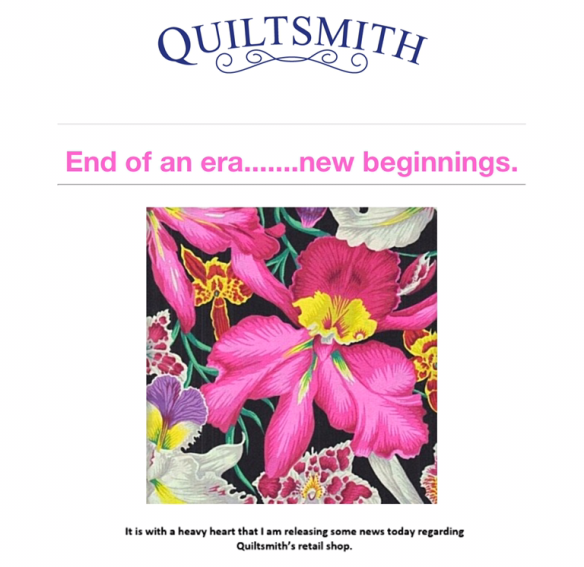 This sad news was received yesterday. Many of our group have been customers of Quiltsmith over many years, enjoyed the beautiful fabrics and attended classes and events organised by Quiltsmith.