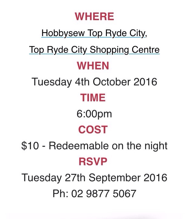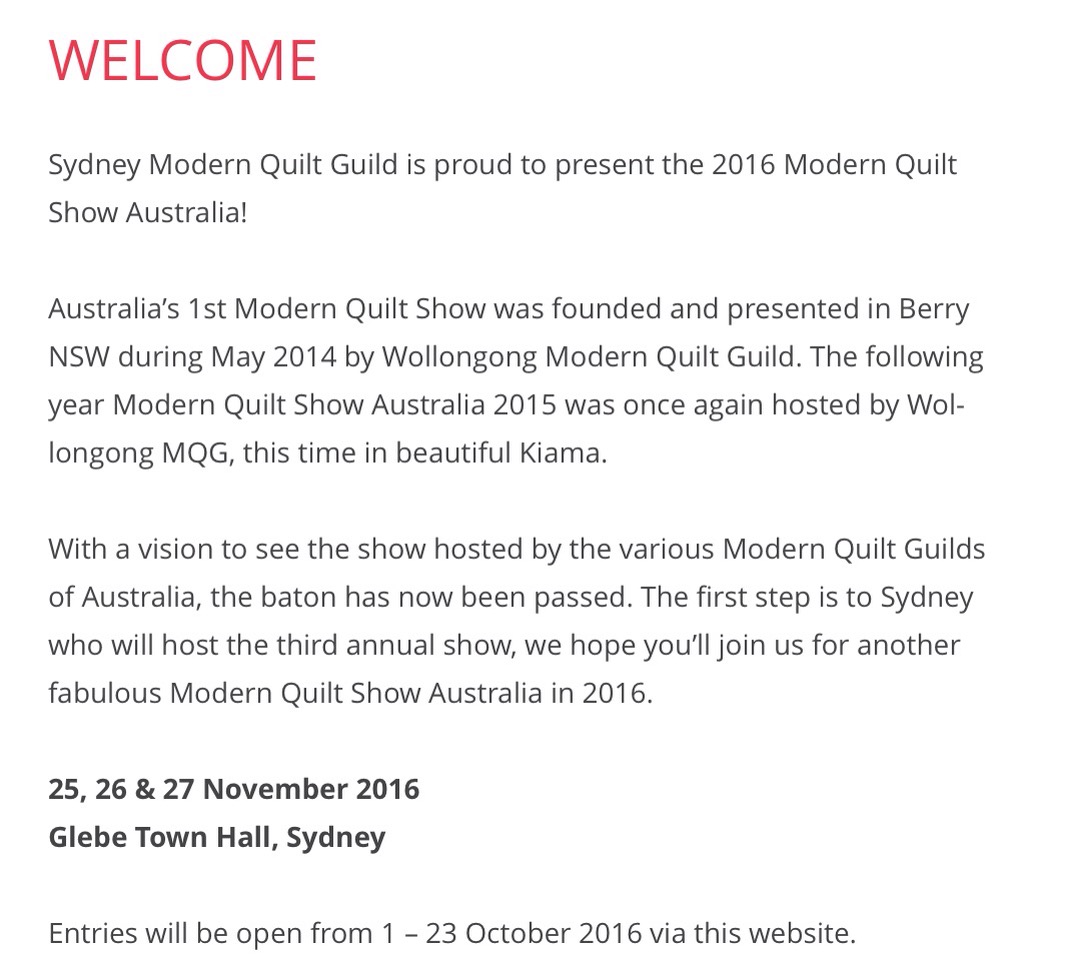Details for the Modern Quilt Guild Show are below. Any quilter who is a resident of Australia may enter, the categories and rules can be found at their website and entries will be taken through the website October 1-23 2016. Workshop places are almost filled but information can be found by calling Material Obsession (see below)