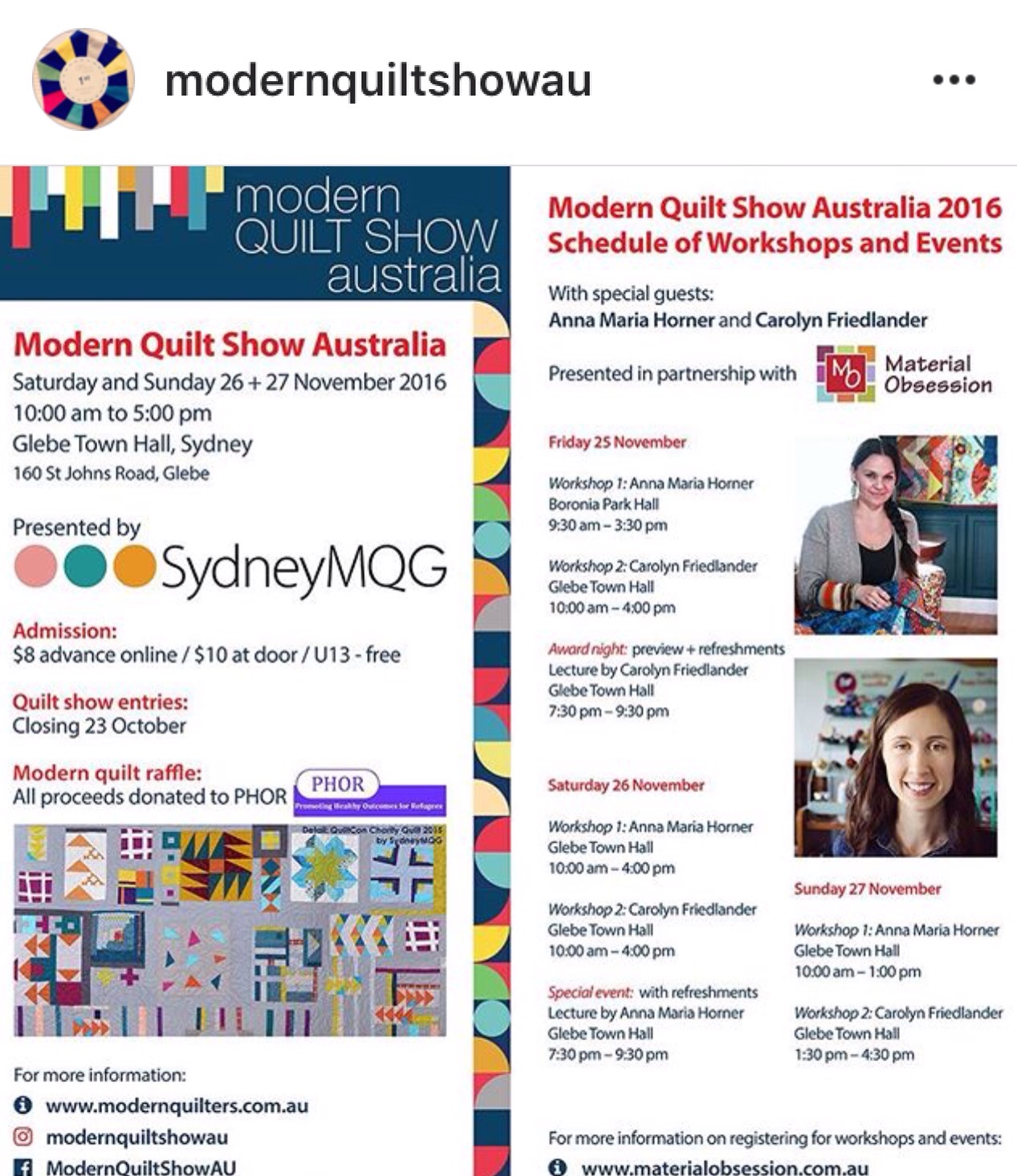 Details for the Modern Quilt Guild Show are below. Any quilter who is a resident of Australia may enter, the categories and rules can be found at their website and entries will be taken through the website October 1-23 2016. Workshop places are almost filled but information can be found by calling Material Obsession (see below)