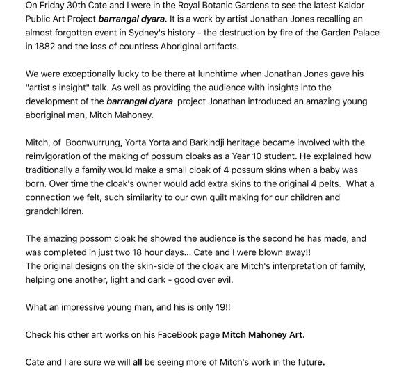Many of our members made the trip to Sutherland Shire for the recent exhibition, Labours of Love, and it was wonderful. The gallery is excellent and we enjoyed a coffee or meal at their café which was also very enjoyable.