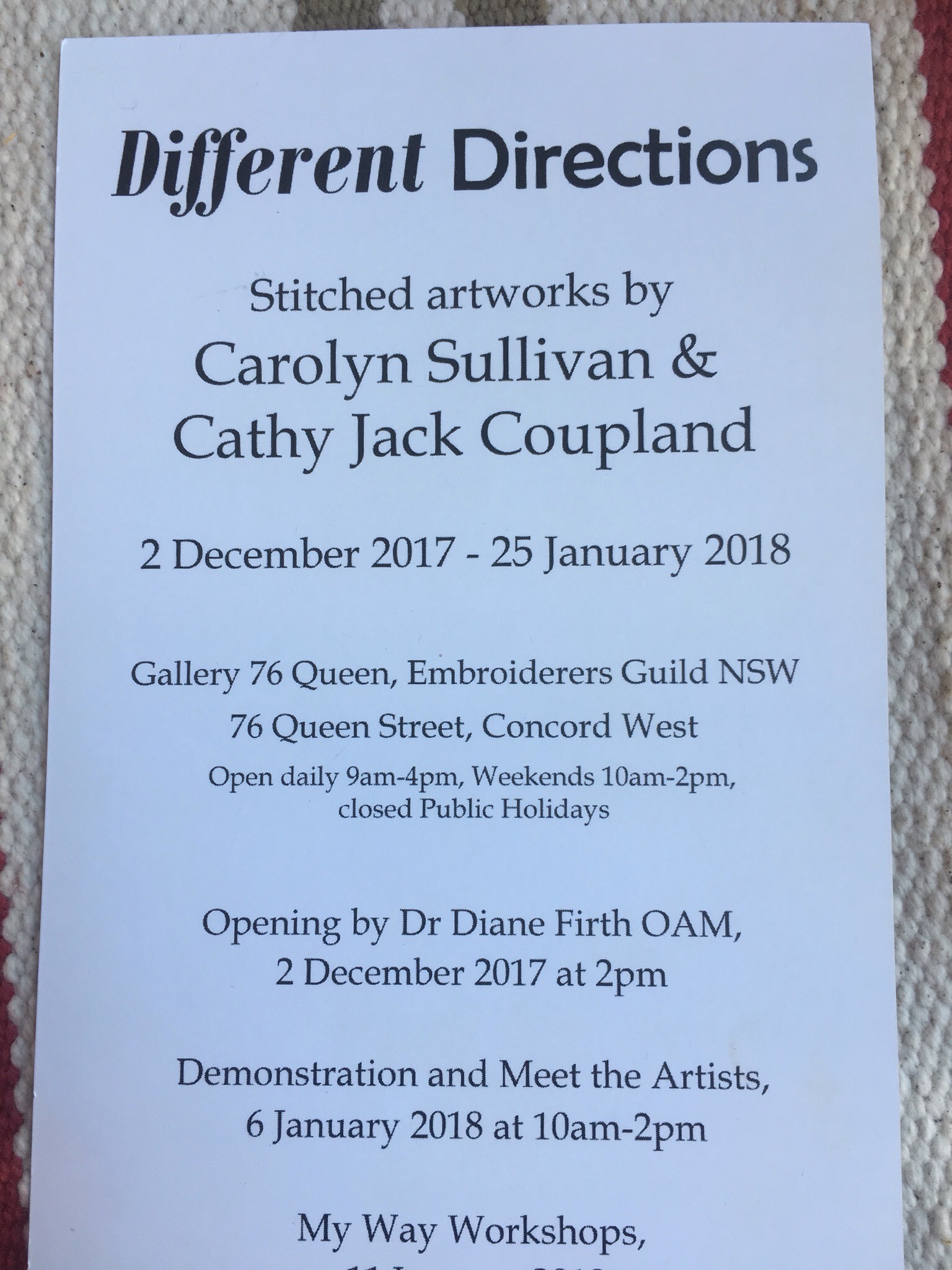 Take a short trip to Concord West to visit the newly opened NSW Embroiderers Guild building and catch this interesting exhibition. It’s on until the 25/1/18 with a meet the artist and demonstration day this Saturday 6/1/18 from 10-2.