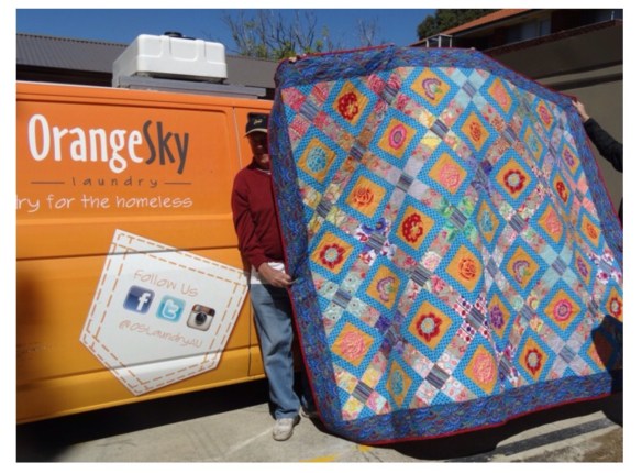 We are proud to be supporting Orange Sky Laundry with our two raffle quilts made by members of Eastwood Patchwork Quilters. Our exhibition will be held at Brush Farm House, 19 Lawson Street, Eastwood from May 5-7, open daily from 10-4.30. Here is one of the quilts with the van.