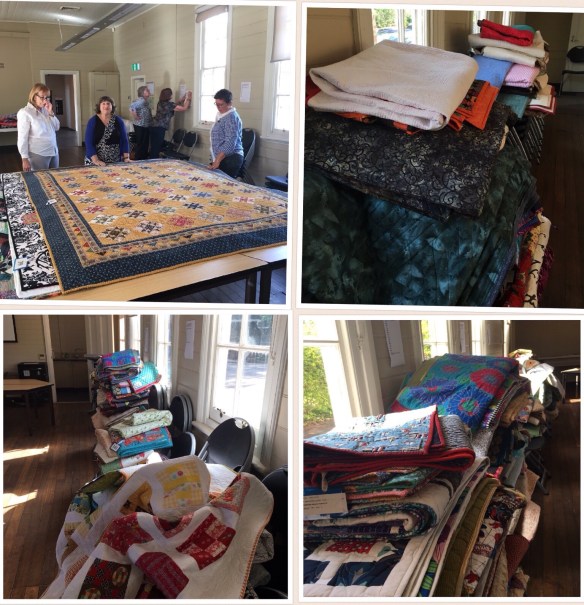Today was the first of three days activity towards our 2017 exhibition, it starts this Friday May 5 and runs through to Sunday May 7th. Piles and piles of quilts arrived at Brush Farm House ready for judging.