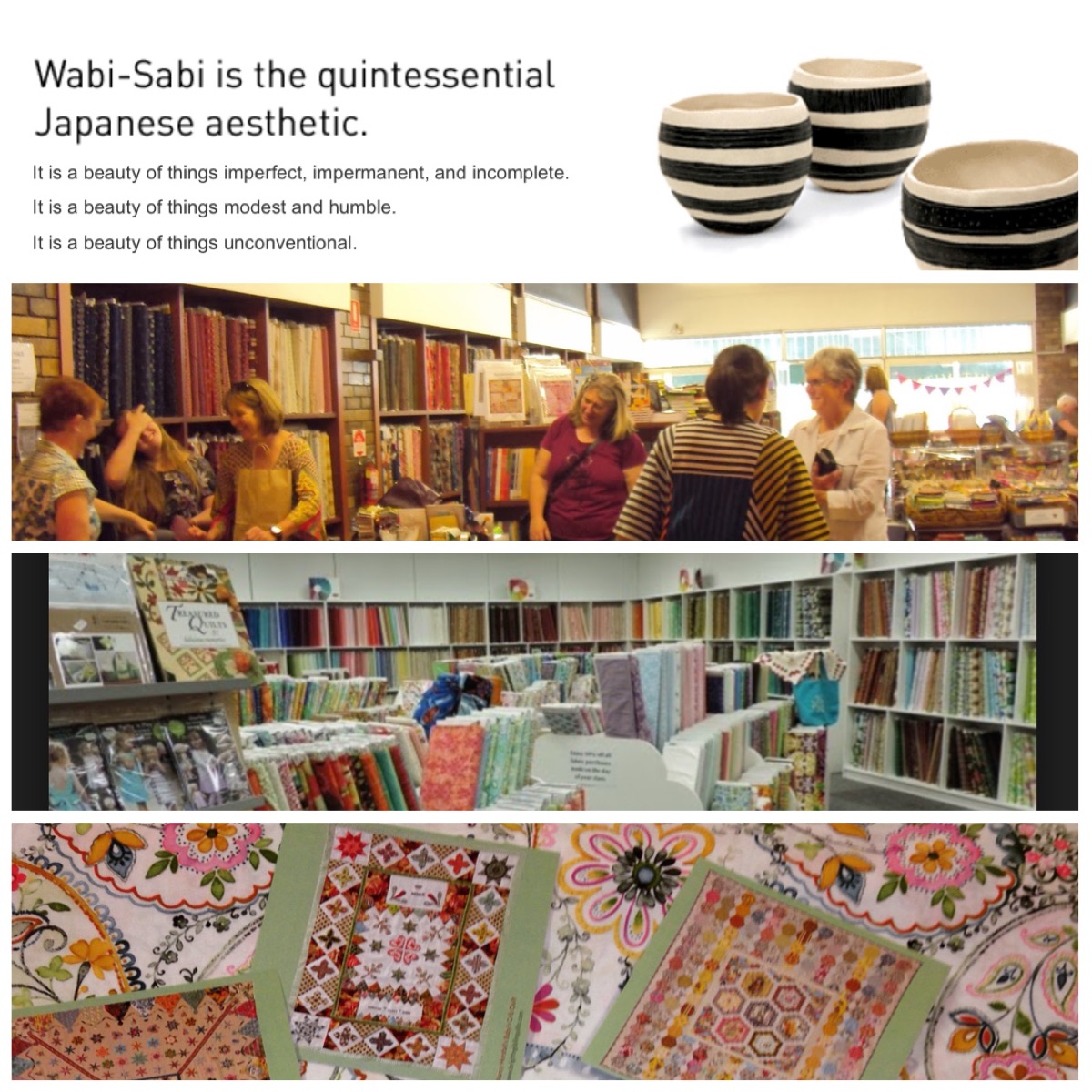 Besides our wonderful member’s craft stall, we will have four quilting/fabric shops visiting our exhibition. They are sure to have an amazing array of temptation to offer all visitors. The shops are Wabi Sabi Designs, Quiltsmith, Kim Bradley Creations, and Cottage Quiltworks.